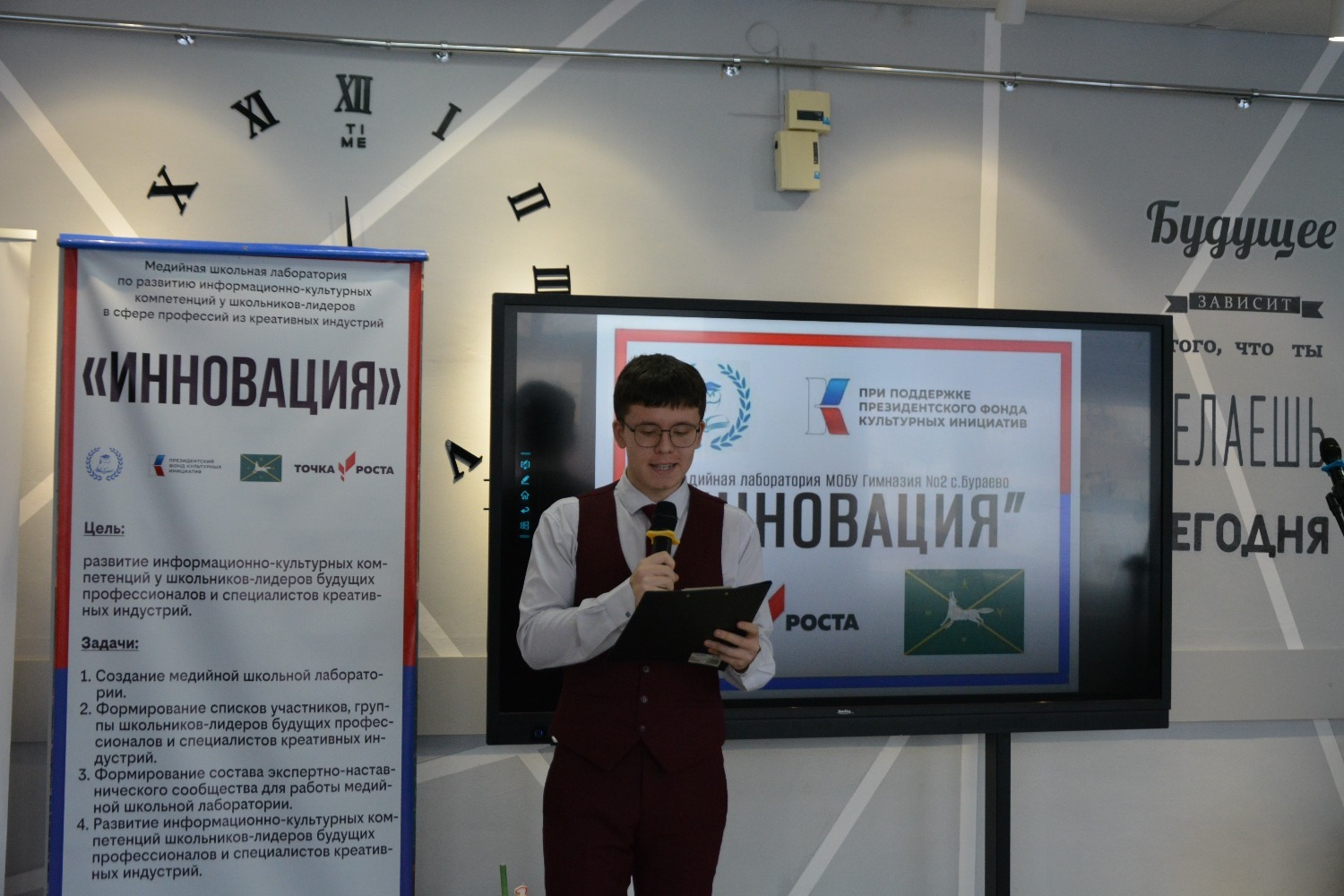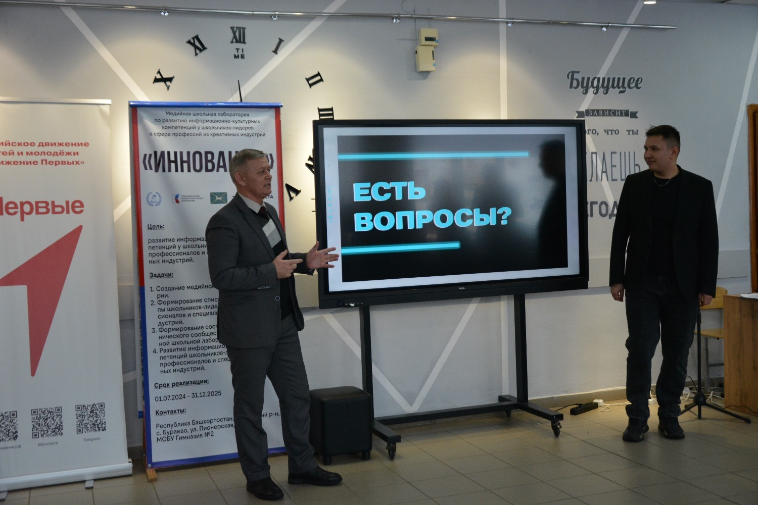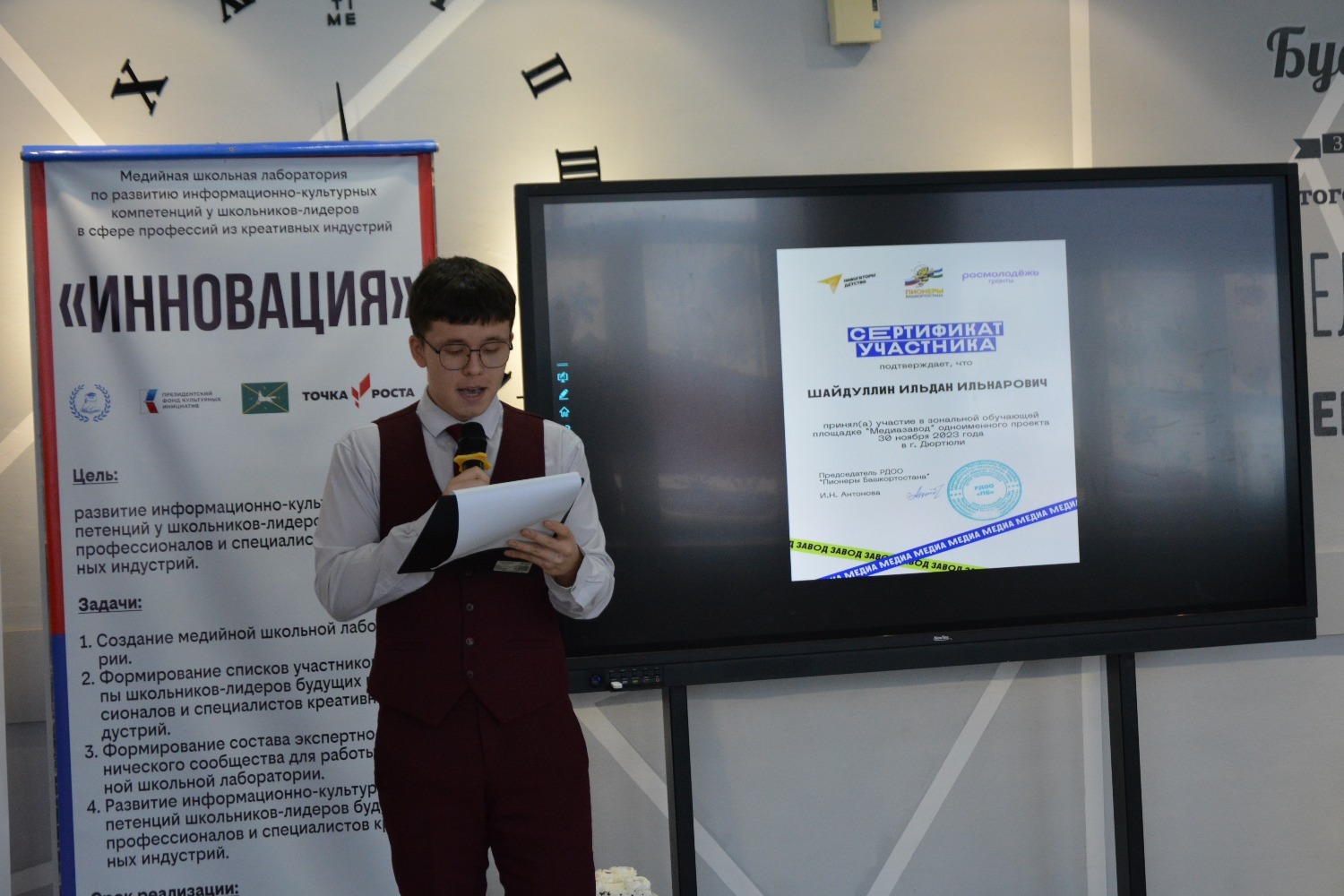 Конференция барышында «Инновация» медиалабораториясендә медиачылар мәдәни инициативаларның президент фондында җиңү кысаларында сатып алынган икенче грант конкурсы җиһазларының эше, укучыларының проектлары турында сөйләделәр, медиалаборатория казанышлары белән уртаклаштылар, ә Марсель Гафиятуллин «Социаль челтәрләрдә постлар бастыру» темасына кызыклы осталык дәресе үткәрде. Конференция панель дискуссия белән тәмамланды, анда Алик Рамил улы кураторлар Әлфидә Дүсмәтовага, Җәмил Әхмәтгалиевка, Илгиз Харисовка, Айгөл Таҗетдиновага, "Беренчеләр хәрәкәт"енең төбәк бүлекчәсе вәкилләре Марсель Гафиятуллинга һәм Марсель Хафизовка Рәхмәт хатларын, шулай ук гимназия директоры «Инновация» медиалабораториясе җитәкчесе Әнисә Мортазинага Русия Федерациясе Дәүләт Думасы депутаты Динар Гыйльметдинов исеменнән Рәхмәт хатын тапшырды.