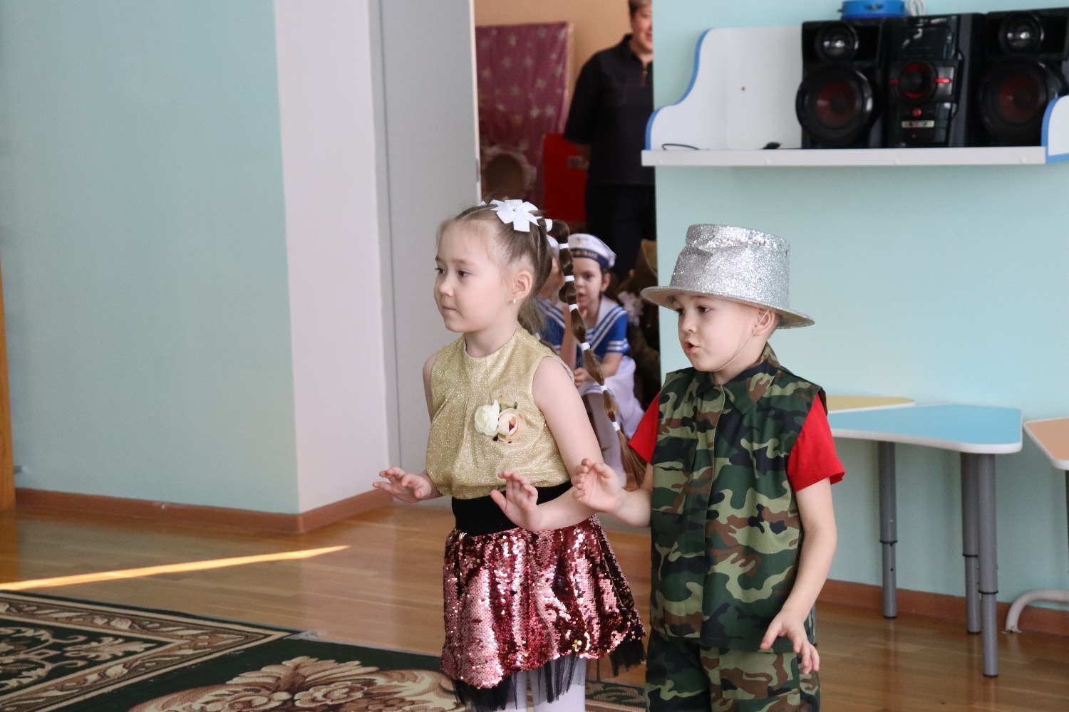 В перерывах между конкурсами, для того, чтобы участники смогли чуточку отдохнуть, воспитанники детского сада выступали с танцами и песнями.